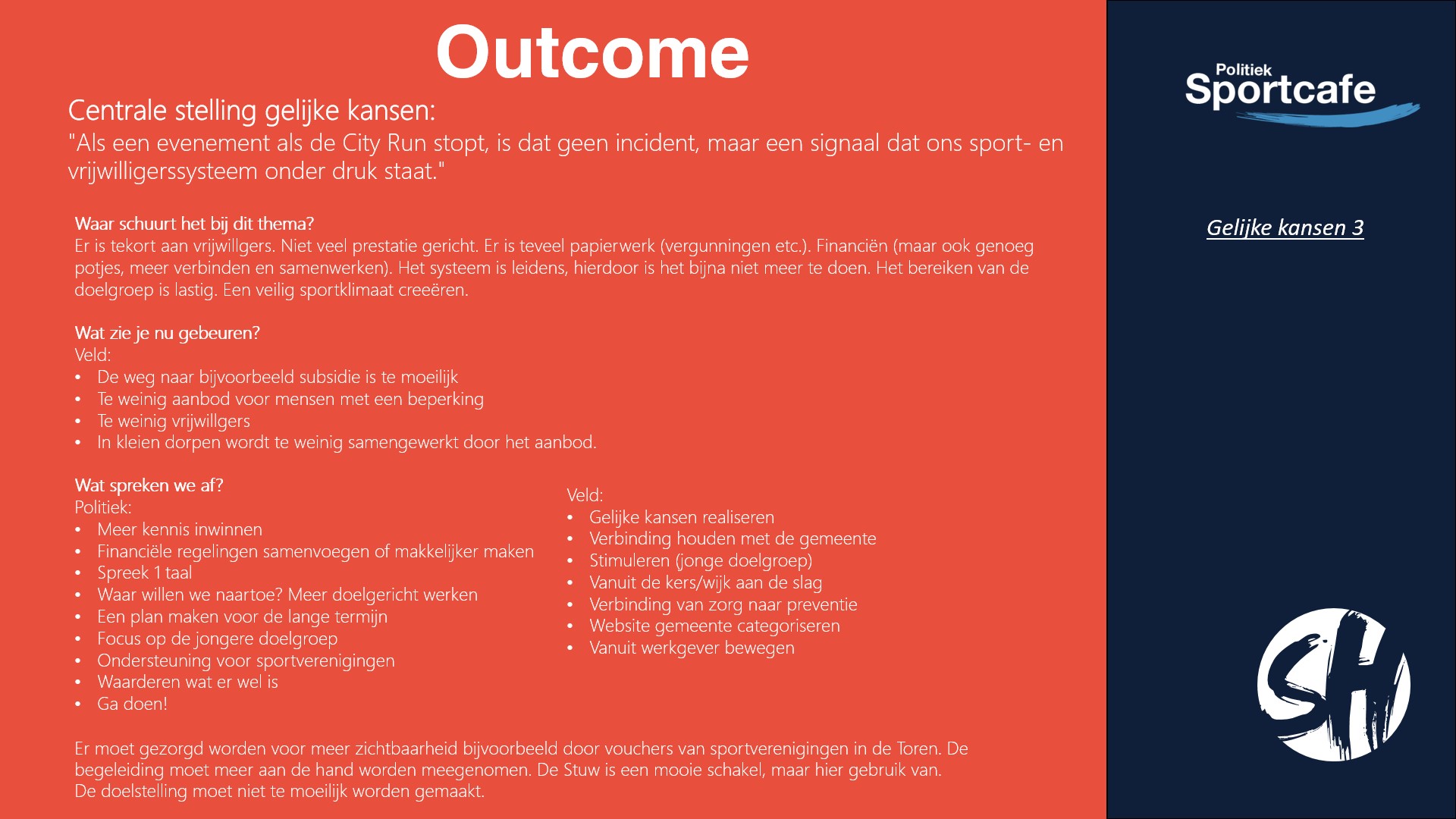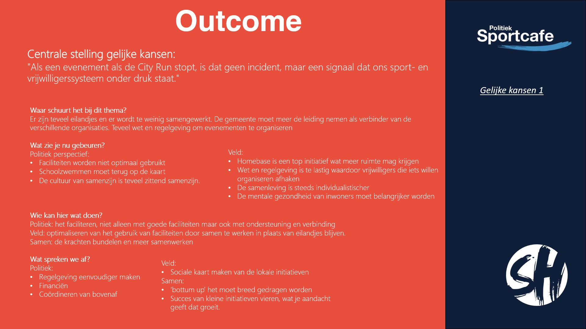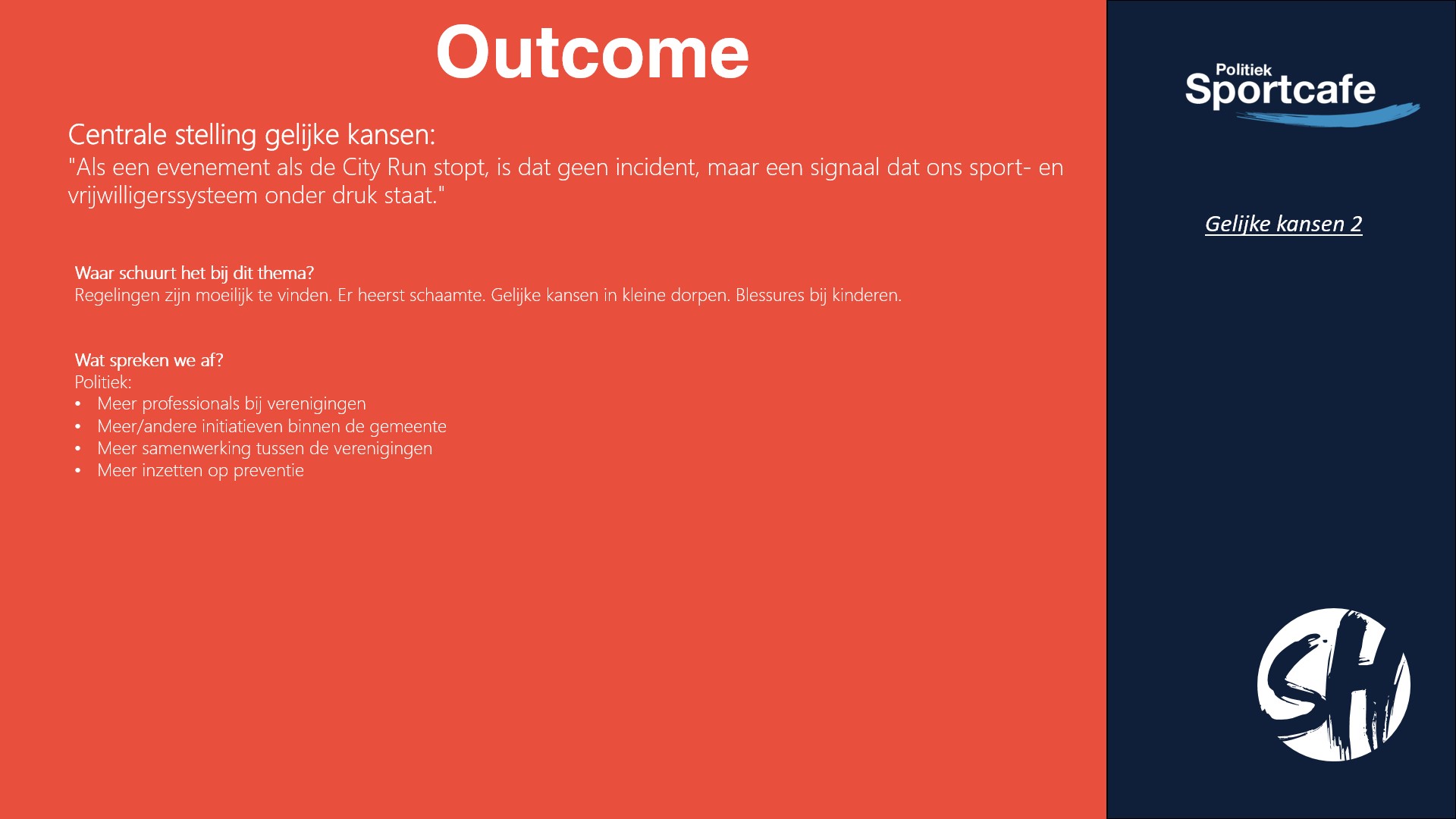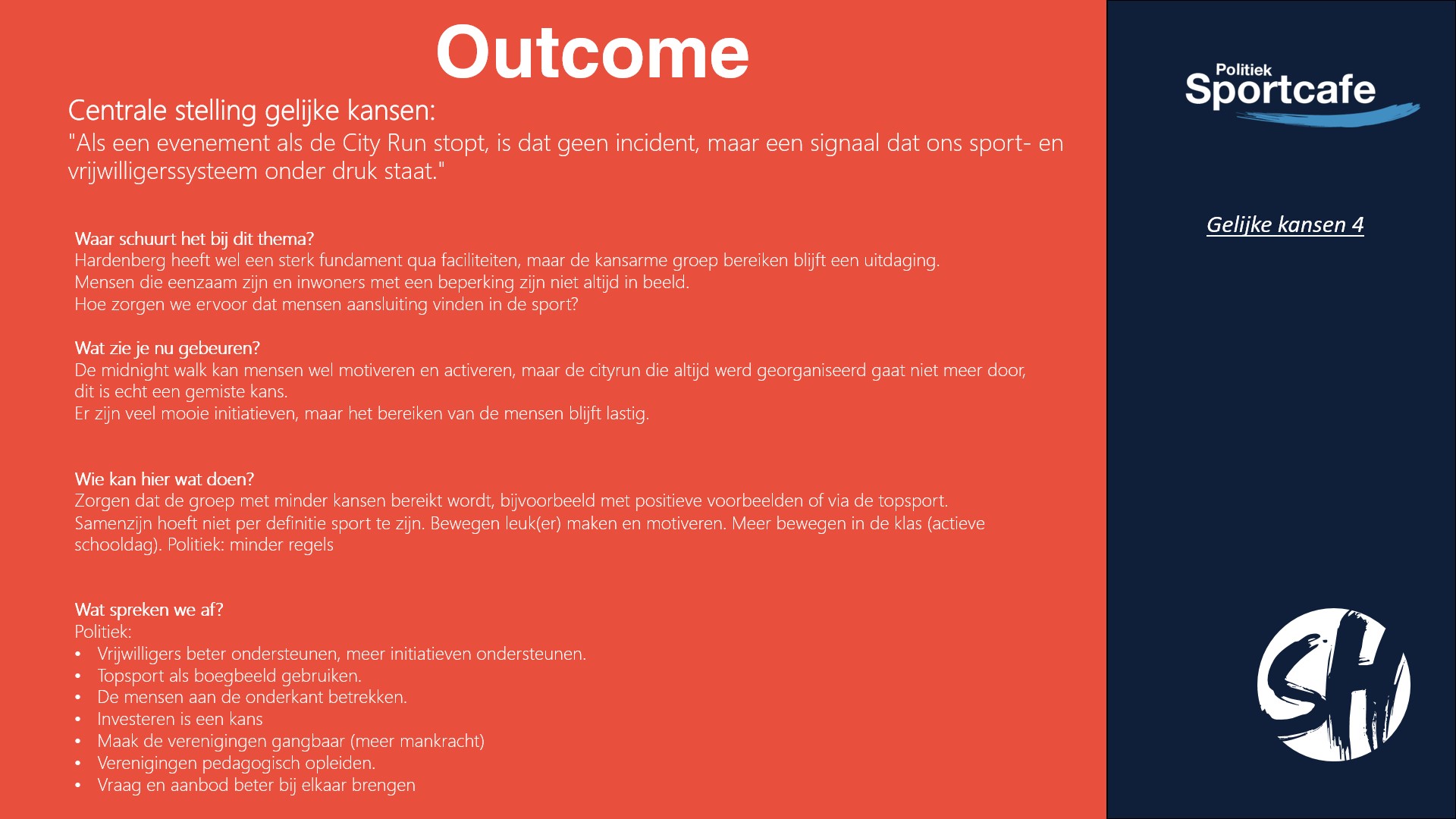 De andere stelling van deze avond was: “Als een evenement als de City Run stopt, is dat geen incident, maar een signaal dat ons sport- en vrijwilligerssysteem onder druk staat.”. Het thema hierbij was: gelijke kansen. Ook hierbij hebben er vier groepjes over gepraat.