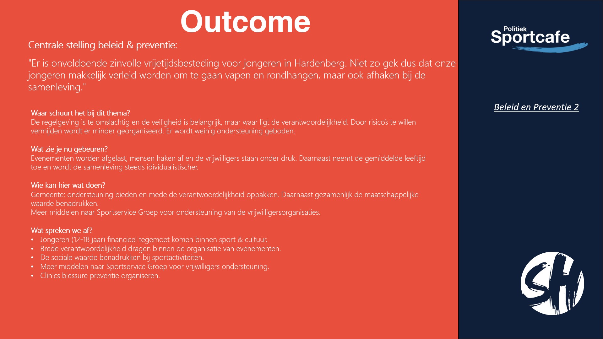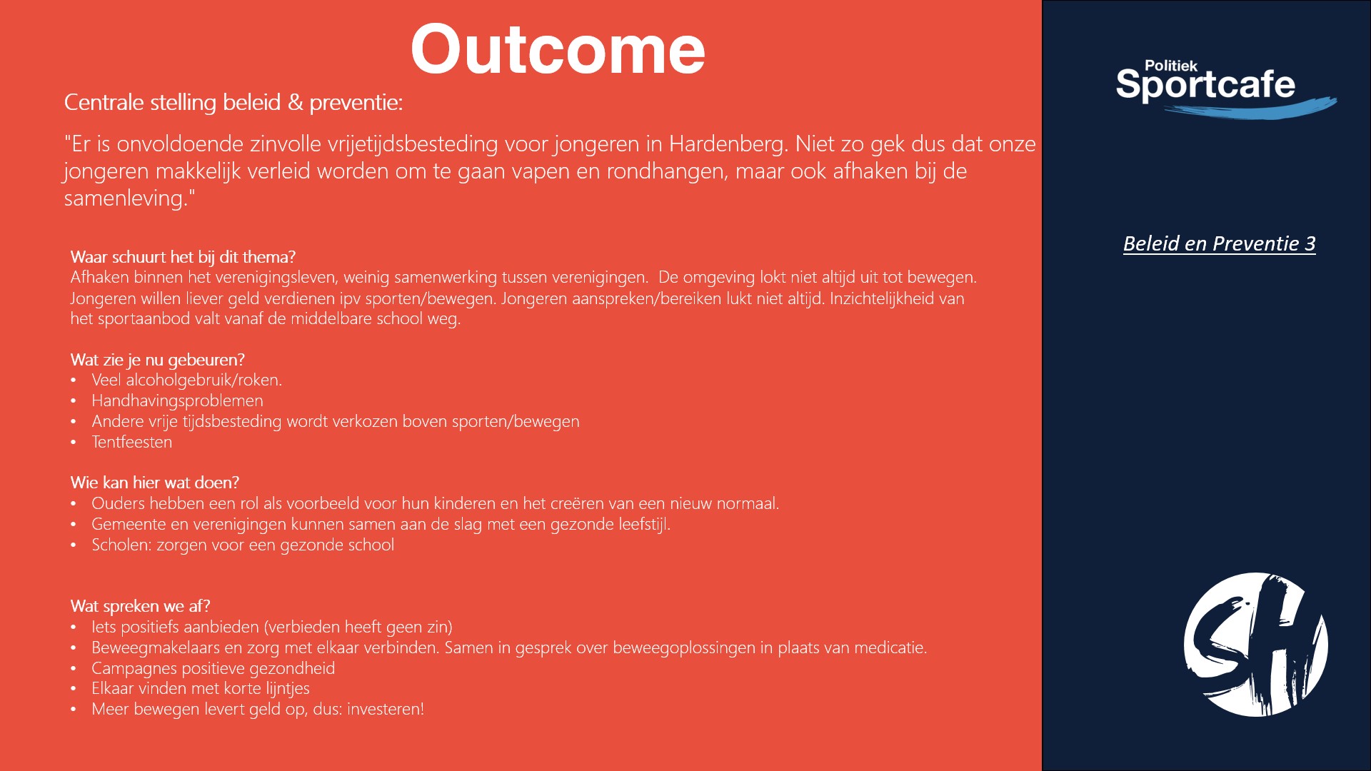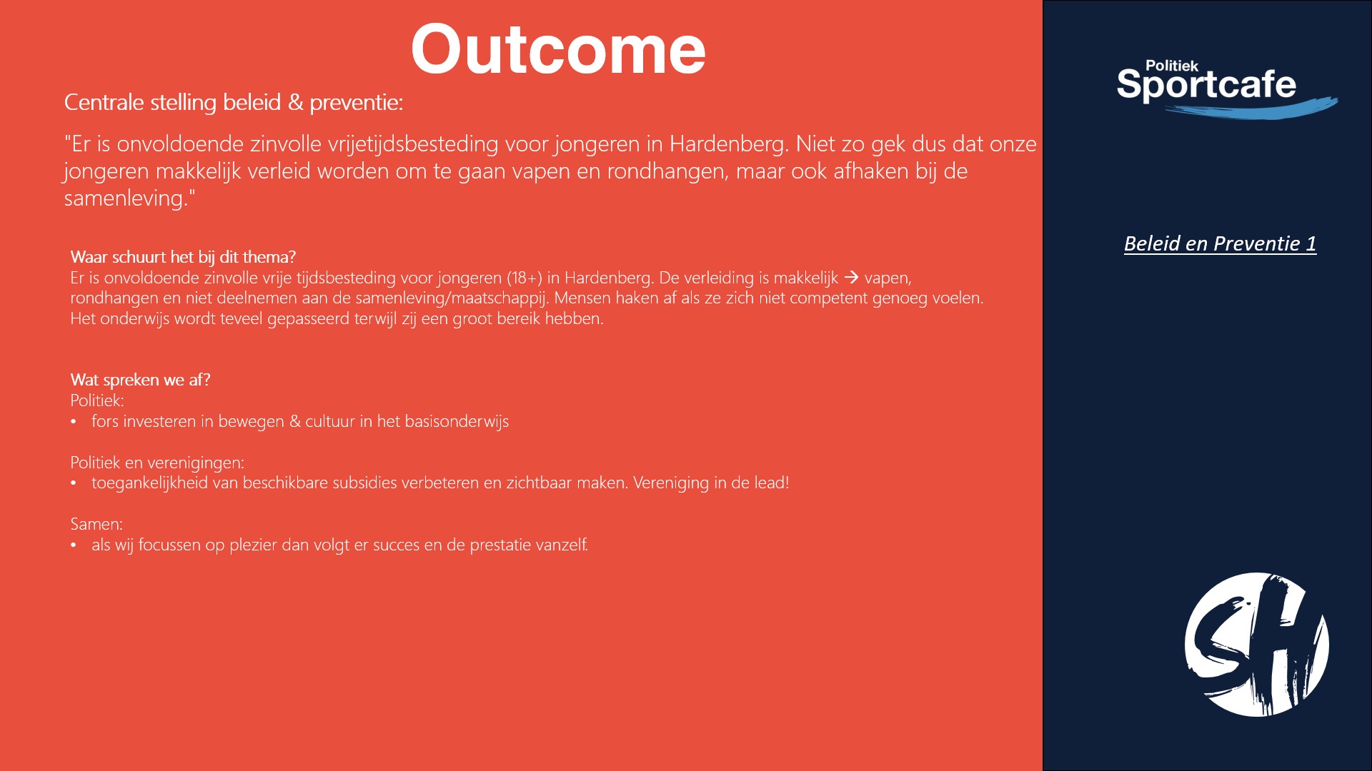 Hieronder vindt u de uitkomst van de avond. In verschillende groepen zijn twee stellingen besproken. De eerste 4 slides gaat over de stelling: “Er is onvoldoende zinvolle vrijetijdsbesteding voor jongeren in Hardenberg. Niet zo gek dus dat onze jongeren makkelijk verleid worden om te gaan vapen en rondhangen, maar ook afhaken bij de samenleving.”. Hier hebben vier groepen over gepraat met als thema: beleid en preventie.